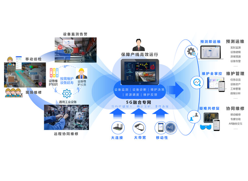 以设备维护要素为核心,以5G����� �������Ƴ������������ �������Ƴ����������� �������Ƴ������������ �������Ƴ�������融合专网能力为底座,打通设备监测、诊����� �������Ƴ������������ �������Ƴ������������ �������Ƴ������������ �������Ƴ�������断、决策、执行和反馈的业务链条,实现设备����� �������Ƴ������������ �������Ƴ����������� �������Ƴ������������ �������Ƴ�������按需维护、设备寿命延长、产线高����� �������Ƴ������������ �������Ƴ������������ �������Ƴ������������ �������Ƴ�������效运行的目标。构建自动采集和人工移动采集多元����� �������Ƴ������������ �������Ƴ������������ �������Ƴ������������ �������Ƴ�������采集方式,对通用工业设备开展����� �������Ƴ������������ �������Ƴ������������ �������Ƴ������������ �������Ƴ�������多域多维特征提取和数字建模,����� �������Ƴ������������ �������Ƴ������������ �������Ƴ������������ �������Ƴ�������智能分析设备健康状况并进行异常����� �������Ƴ����������� �������Ƴ������������ �������Ƴ������������ �������Ƴ�������预警,利用远程协作、数字工作流等手段赋能设备维护����� �������Ƴ������������ �������Ƴ����������� �������Ƴ������������ �������Ƴ������人员高效运维。